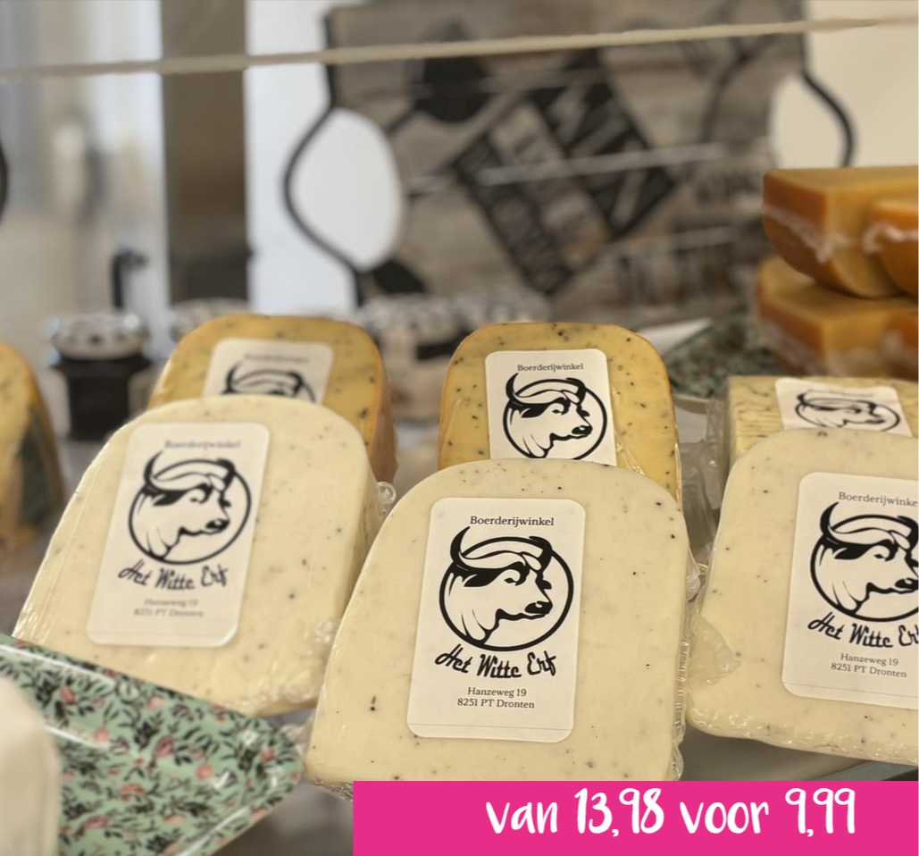 Fenegriekkaas is een milde, romige (halfharde) Goudse kaas of geitenkaas, verrijkt met de aromatische zaden van de fenegriekplant. De zaden geven de kaas een uitgesproken, nootachtige smaak die doet denken aan walnoten. Het is een populaire, lichtzoete kaassoort die vaak 8-12 weken rijpt en perfect past op een kaasplank, bij de borrel of op brood. Met jouw Pas van Dronten nu van € 13,98 voor slechts € 9,99 p.kg.